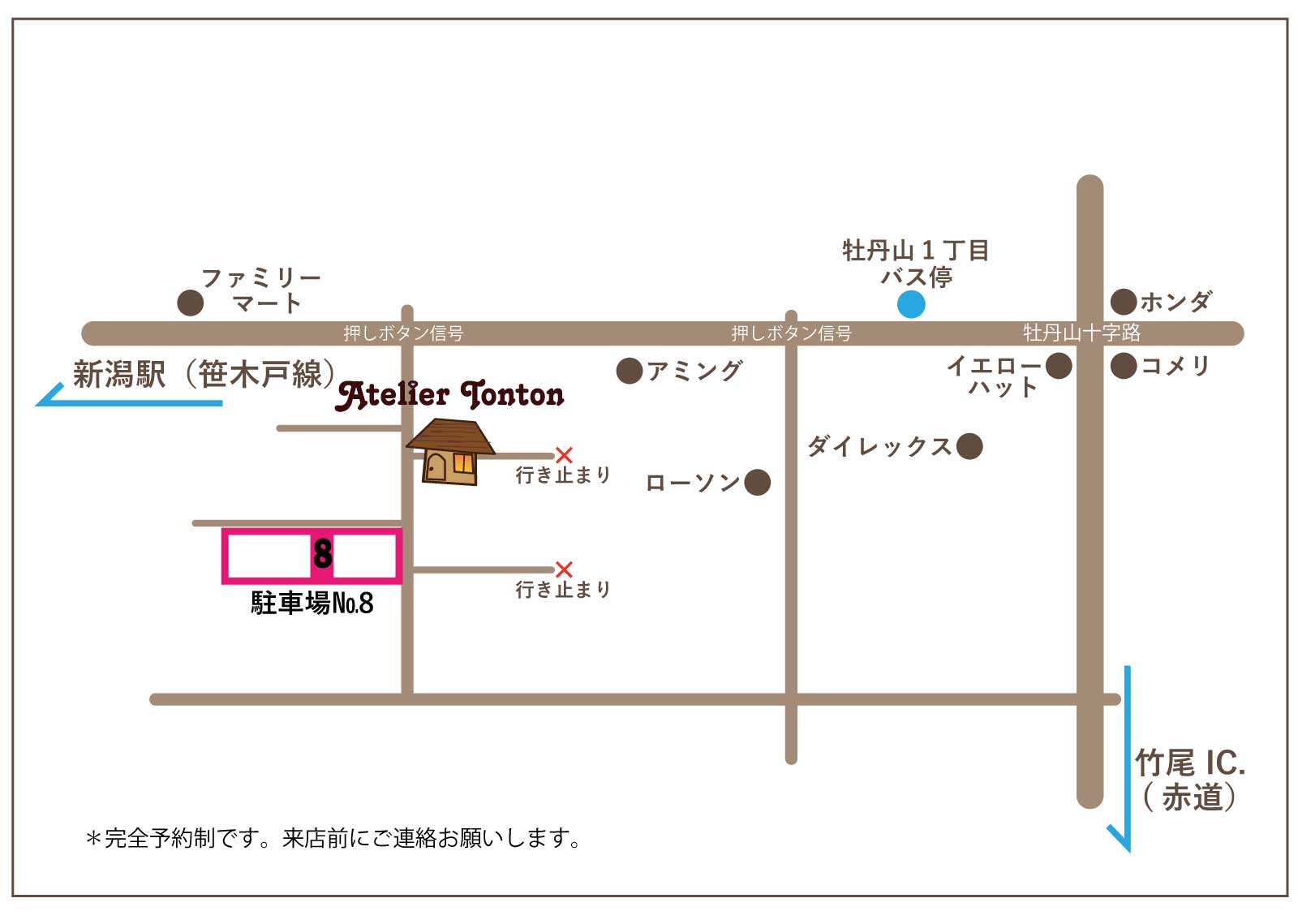 - お車でお越しの方には、アトリエトントンの専用駐車場に停めていただきます。アトリエトントン玄関前の路地は行き止まりです。お隣の駐車場で方向転換しないようご配慮願います。 駐車場の番号は「8」です。ご利用の際は、お間違いのないようにお願いします。来店ご予約時に駐車場を詳しくご案内いたします。